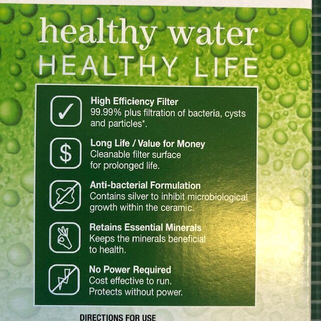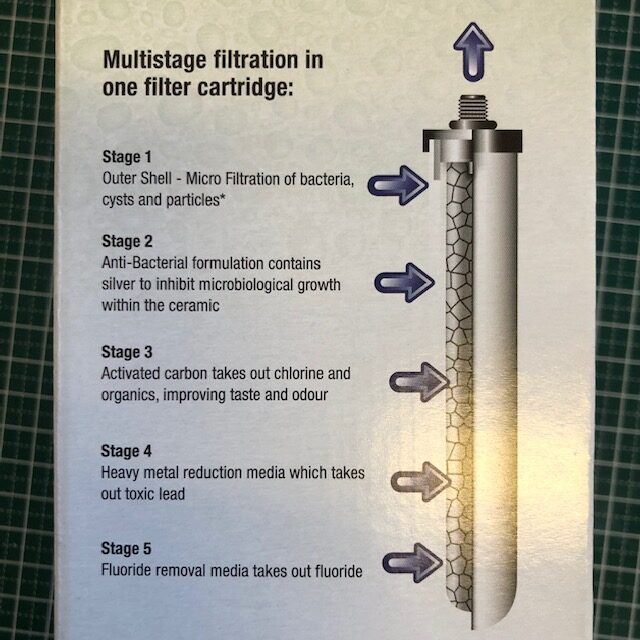 Cette cartouche inclut 5 étapes de filtration de l’eau en un seul élément: la partie extérieure en céramique micro-poreuse élimine les organismes pathogènes (bactéries, parasites, kystes…), les sédiments et impuretés, la partie intérieure de la céramique avec sa formule anti bactérienne évite tout développement microbiologique et enfin la partie interne -constituée de charbon actif en granulés combiné avec un média anti métaux lourds et un média anti-fluor – élimine le goût, les mauvaises odeurs, les produits chimiques et résidus de médicaments, les métaux lourds et le fluor (naturel ou additionné à l’eau).